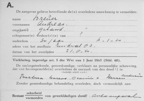 Andreas Breuer overleed op woensdag 21 augustus 1940 in het Gemeenteziekenhuis Zuidwal aan zijn verwondingen, die hij eerder die dag opliep door een auto-ongeval. Op de Waalsdorperweg in Den Haag reed een auto, bestuurd door een Duitse militair, een colonne van Duitse militairen aan. Van de Gemeentepolitie rukte de Fotografische en Dactyloscopische Dienst van de Technische Opsporings- en Herkenningsdienst uit naar de Waalsdorperweg. Door deze dienst werden enkele Leica foto-opnamen gemaakt. Deze foto's waren ten behoeve van de SS, gevestigd aan de Cremerweg 50 in Den Haag, gemaakt. Andreas Breuer werd op zaterdag 24 augustus 1940 op het Ehrenfriedhof begraven.