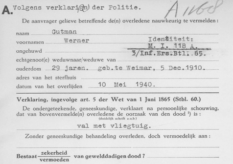 In de ochtend van vrijdag 10 mei 1940 kwam hij om het leven door het neerstorten van zijn Duitse Junkers Ju52 transportvliegtuig in de Tweede Adelheidstraat. Om 14:00 uur werd door de politie gemeld dat de GGD aan hen had gemeld dat er 17 stoffelijke overschotten van Duitse militairen van de Adelheidstraat naar de Algemene Begraafplaats hadden vervoerd, ook onder andere die van Werner Gutmann. Hij werd op woensdag 15 mei 1940 op het Ehrenfriedhof begraven.