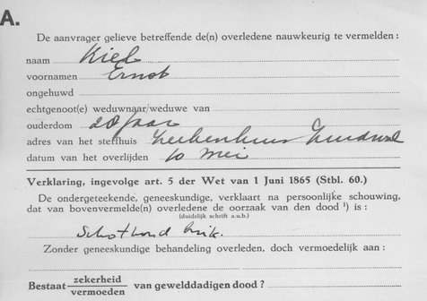 Ernst Kiel raakte op vrijdag 10 mei 1940 tijdens de gevechten op of rond het vliegveld Ypenburg bij Rijswijk zwaargewond en werd naar het Gemeenteziekenhuis Zuidwal in Den Haag overgebracht. Na aankomst in het ziekenhuis werd hij geopereerd aan 2 gaten in de dikke darm, 2 gaten in de dunne darm, een veneuze bloeding die werd onderbonden en 3 schotwonden in de rug en in het achterhoofd die ook geexideerd werden. Hij overleed echter nog dezelfde dag aan een schotwond in de buik. Ernst Kiel werd op zaterdag 18 mei 1940 op het Ehrenfriedhof begraven.