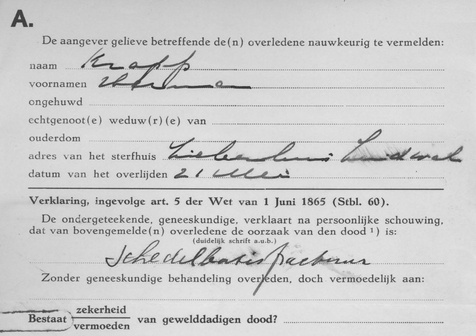 Op maandag 20 mei 1940 vond rond 18:00 uur op het Oranjeplein een aanrijding plaats tussen een autobus van de Haagsche Tramweg Maatschappij (HTM), gemerkt H-Z-46090 en bestuurd door de heer Liebrecht, en een Duitse legermotorrijwiel. Dit Duitse legermotorrijwiel werd bestuurd door Jozef Groos, 24 jaar, soldaat bij 314-1/Inf.Ers.Btl.365 en reed te snel en links. Jozef Groos liep door deze aanrijding een zware hersenschudding op, terwijl duopassagier Hermann Kropp een kaakfractuur en een hersenschudding opliep. De beide Duitse militairen werden per ambulance door de GG&GD naar het Gemeente Ziekenhuis Zuidwal overgebracht. De Duitse militaire overheid onderzocht onder leiding van de Oberfeldwebel Von Pents een onderzoek naar de schuldvraag. Hermann Kropp overleed op woensdag 22 mei 1940 in het ziekenhuis aan een schedelbasisfractuur. Hij werd op donderdag 23 mei 1940 op het Ehrenfriedhof begraven.