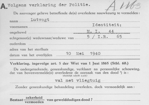 In de ochtend van vrijdag 10 mei 1940 kwam hij om het leven door het neerstorten van zijn Duitse Junkers Ju52 transportvliegtuig in de Tweede Adelheidstraat. Om 14:00 uur werd door de politie gemeld dat de GGD aan hen had gemeld dat er 17 stoffelijke overschotten van Duitse militairen van de Adelheidstraat naar de Algemene Begraafplaats hadden vervoerd, ook onder andere die van Franz Lütvogt. Hij werd op woensdag 15 mei 1940 op het Ehrenfriedhof begraven.