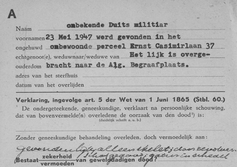 Op vrijdag 23 mei 1947 werd in de kelder van het onbewoonde perceel Ernst Casimirlaan 37 door een tweetal jongens de overblijfselen van een onbekende Duitse militair in uniform, die tijdens of vlak na de oorlog vermoedelijk zelfmoord had gepleegd, aangetroffen. Er werd een schotwond in de schedel geconstateerd, terwijl er een verroest pistool naast het stoffelijk overschot werd aangetroffen. Na de vondst werd het stoffelijk overschot overgebracht naar de Algemene Begraafplaats. Door de Dienst Identificatie en Berging werd, ten behoeve van de identificatie van de Gemeentepolitie, het stoffelijk overschot overgenomen. Op het stoffelijk overschot werd een gouden ring met de inscriptie E.H. 4-6-'38 aangetroffen. Als doodsoorzaak werd een schotwond schedel; inschot rechter citura sagamalis en een inschot links citura sagamalis vastgesteld.