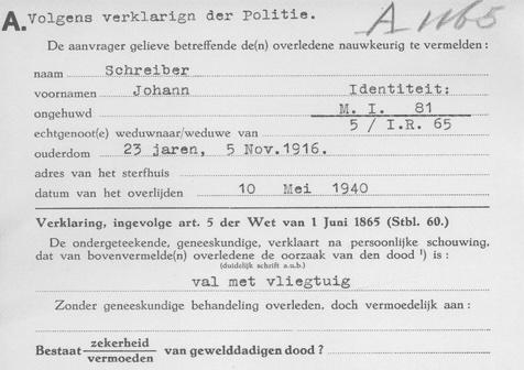 In de ochtend van vrijdag 10 mei 1940 kwam hij om het leven door het neerstorten van zijn Duitse Junkers Ju52 transportvliegtuig in de Tweede Adelheidstraat. Om 14:00 uur werd door de politie gemeld dat de GGD aan hen had gemeld dat er 17 stoffelijke overschotten van Duitse militairen van de Adelheidstraat naar de Algemene Begraafplaats hadden vervoerd, ook andere die van Johann Schreiber. Hij werd op woensdag 15 mei 1940 op het Ehrenfriedhof begraven.