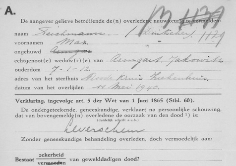 Max Teichmann raakte op vrijdag 10 mei 1940 zwaargewond tijdens de gevechten op of rond het hulpvliegveld Ockenburg. Hij overleed nog dezelfde dag als gevolg van een leverscheur in het Rode Kruis Ziekenhuis in Den Haag. Max Teichmann werd op woensdag 15 mei 1940 op het Ehrenfriedhof begraven.