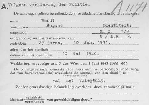 In de ochtend van vrijdag 10 mei 1940 kwam hij om het leven door het neerstorten van zijn Duitse Junkers Ju52 transportvliegtuig in de Tweede Adelheidstraat. Om 14:00 uur werd door de politie gemeld dat de GGD aan hen had gemeld dat er 17 stoffelijke overschotten van Duitse militairen van de Adelheidstraat naar de Algemene Begraafplaats hadden vervoerd, ook onder andere die van August Wendt. Hij werd op woensdag 15 mei 1940 op het Ehrenfriedhof begraven.