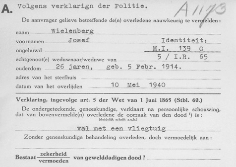 In de ochtend van vrijdag 10 mei 1940 kwam hij om het leven door het neerstorten van zijn Duitse Junkers Ju52 transportvliegtuig in de Tweede Adelheidstraat. Om 14:00 uur werd door de politie gemeld dat de GGD aan hen had gemeld dat er 17 stoffelijke overschotten van Duitse militairen van de Adelheidstraat naar de Algemene Begraafplaats hadden vervoerd, ook onder andere die van Josef Wielenberg. Hij werd op woensdag 15 mei 1940 op het Ehrenfriedhof begraven.